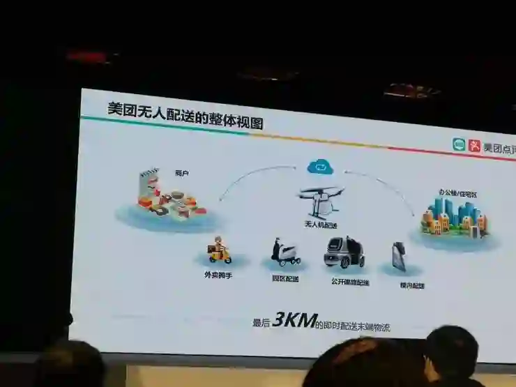 右下方展示的是我们早期的一个配送无人机,这个无人机是在北京北六环以外的一个测试场里飞行,它下面带着一个白色盒子就是我们的餐箱,所以它可以自动地从一个地方飞到指定目的地,然后把餐箱送到用户所在机场,在机场我们会有一定装置,把餐箱送到用户手上。