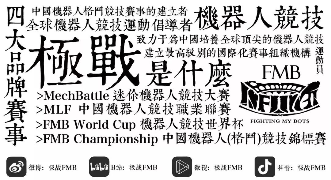 这一次,极战FMB将倾尽全力,将“中国国际机器人竞技公开赛”缔造成一个走在世界前列的机器人竞技赛事,让更多的人了解机器人竞技,也让更多爱好者拥有站上赛场完成自己儿时梦想的机会。