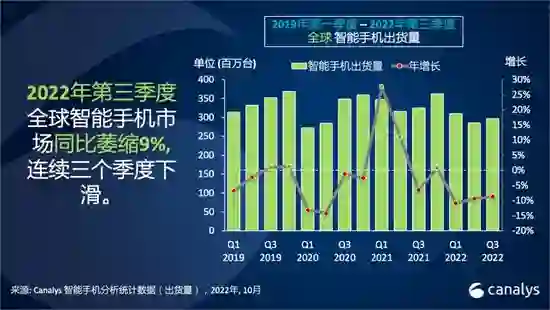 近期,知名数据统计机构 Canalys 发布的最新数据报告显示:2022 年第三季度全球智能手机市场同比下滑 9%,这已经是智能手机行业连续三个季度下滑。