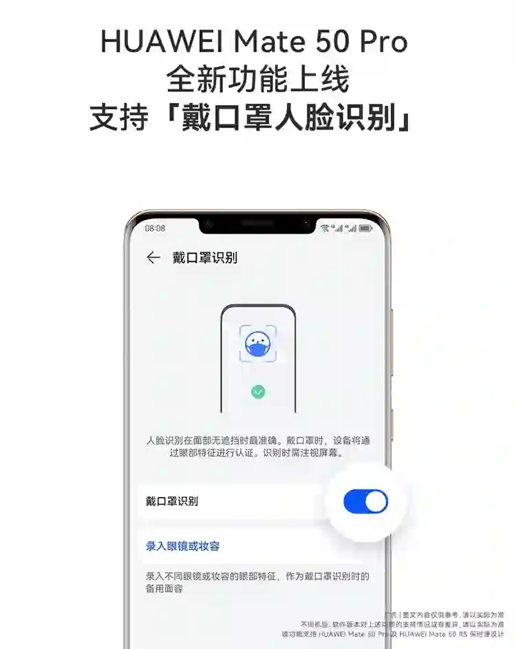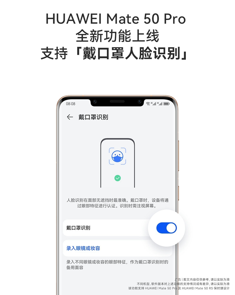 此前,苹果手机新增了戴口罩面部解锁功能,在户外无需摘下口罩就可以面部解锁。前不久,华为 Mate50 Pro 正在测试戴口罩面部解锁的功能,今日华为官方正式宣布,华为 Mate50 Pro 的戴口罩人脸识别功能正式上线。