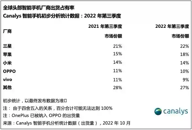其中,三星通过大力开展促销活动来减少渠道库存,市场份额达到 22%,领先市场。小米、OPPO 和 vivo 全球市场份额分别达到 14%、10% 和 9%。报告指出,苹果是本季度前五名中唯一一家实现同比正增长的厂商,在市场低迷期间,由于市场对 iPhone 手机的需求相对具有韧性,苹果以 18% 的份额进一步提高了其市场地位。