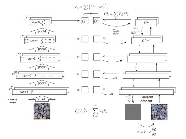 于是Gatys套了个Gramian matrix上去算了一下那些不同局部特征的相关性,把它变成了一个统计模型,于是就有了一个不用手工建模就能生成纹理的方法。