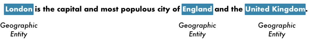 这些名词中有一些是真实存在的。例如,「London 伦敦」、「England 英格兰」和「United Kingdom 英国」代表地图上的物理位置。很高兴能检测到这一点!利用这些信息,我们可以使用 NLP 自动提取到文档中提到的真实世界地名的列表。