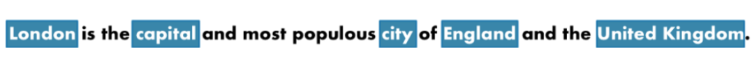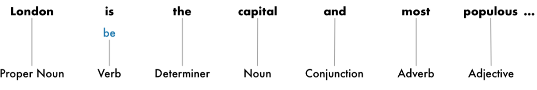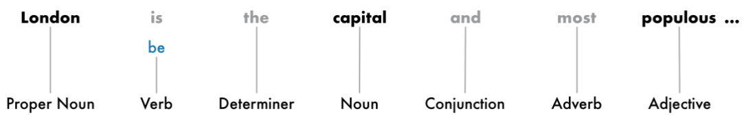 有了这些信息,我们就可以开始获取一些非常基本的意思了。例如,我们可以看到句子中的名词包括「伦敦」和「首都」,所以这个句子很可能说的的是关于伦敦。