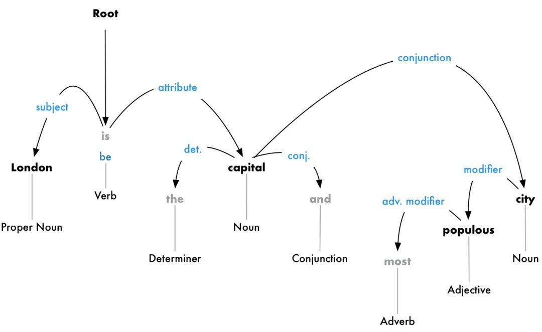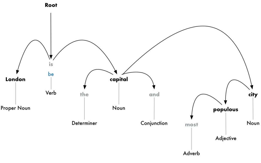 这棵解析树告诉我们,句子的主语是名词「London」,它与「capital」有「be」关系。我们终于知道了一些有用的东西——伦敦是一个首都!如果我们遵循完整的解析树的句子(除上方所示),我们甚至会发现,伦敦是英国的首都。