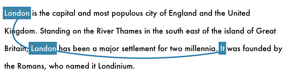 人类阅读这个句子时,可以很容易地理解「it」的意思是「London」。共指解析的目的是通过追踪句子中的代词来找出相同的映射。我们想找出所有提到同一个实体的单词。