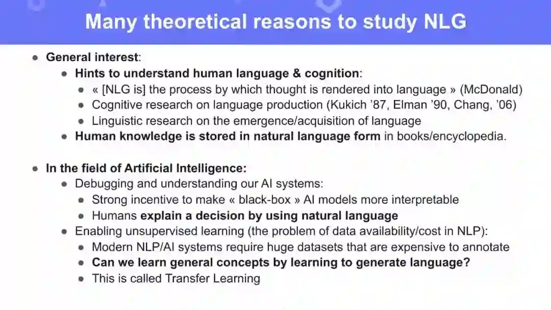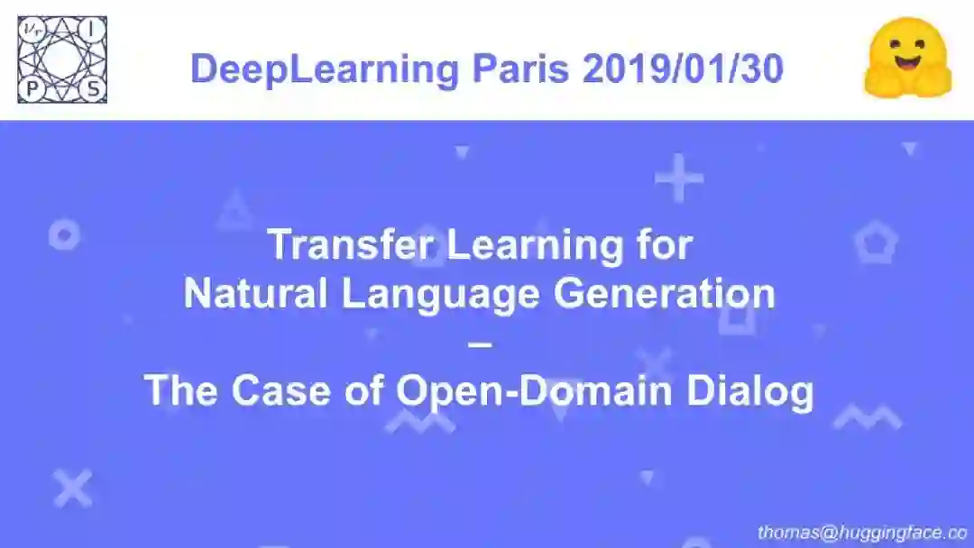 【导读】本文介绍一份关于面向自然语言生成的迁移学习的PPT《Transfer Learning for Natural Language Generation – The Case of Open-Domain Dialog》。该PPT以开放领域对话为场景,介绍迁移学习在自然语言生成中的应用。
