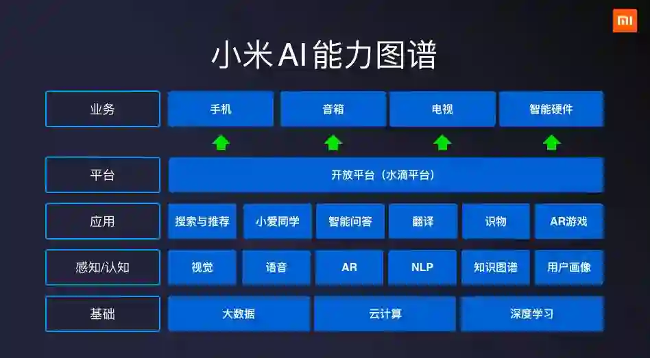 下面是小米的AI能力图谱:从基础的大数据、深度学习,到中间的感知、认知层,再到上面的开放平台,对接小米的各个业务与产品,以及生态链的产品。