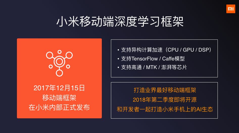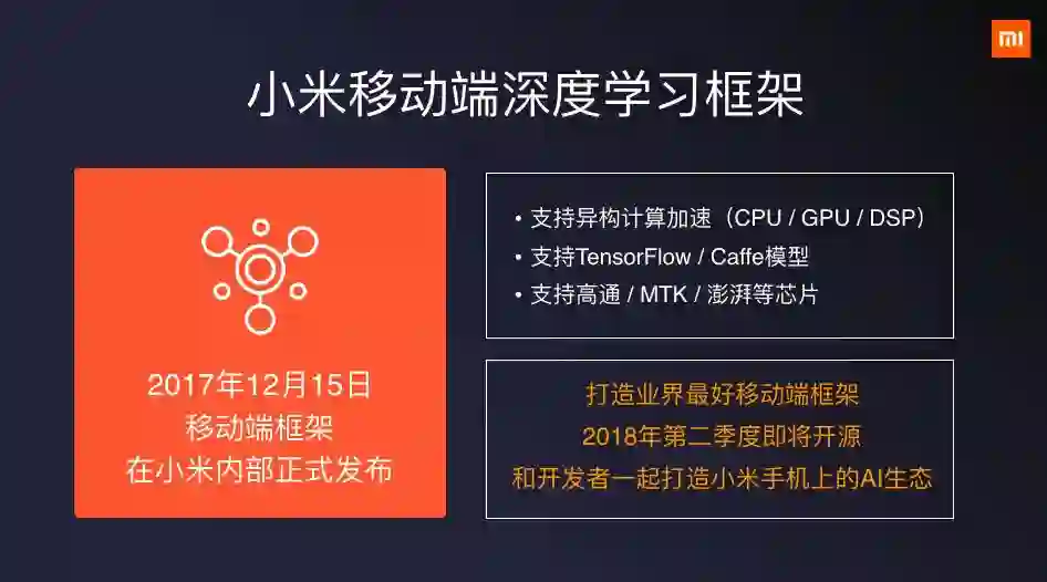 另外,小米也准备在今年第二季度开源小米自己的移动端深度学习框架,这个框架已经支持了CPU、DSP、GPU、高通和小米自己的澎湃芯片,支持TensorFlow和Caffe等模型,目标是打造业内最好的移动端深度学习框架。