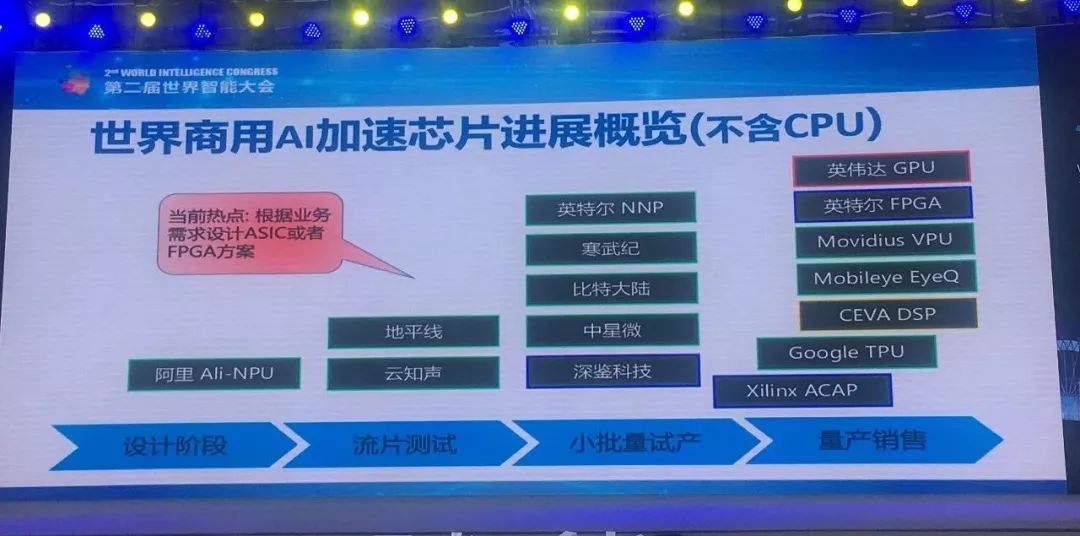 可以看到,目前能够达到稳定量产销售的基本上都是国际公司。红色的话是GPU架构为基础,蓝色的是FPGA相关的芯片,绿色的都是ASIC,黄色的是DSP。目前的主流是根据具体的业务的需求,做ASIC或者FPGA加速方案。