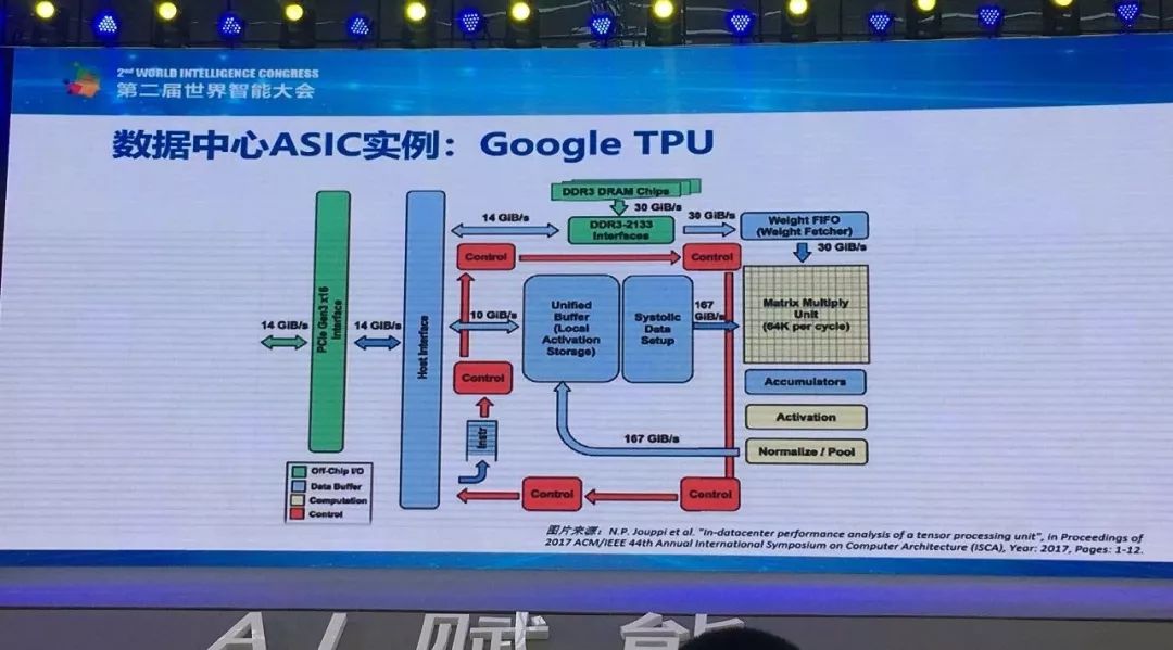 目前来讲做最好的一个方案,很可能需要去选择多种芯片来组合使用。举个例子,谷歌的TPU的特点是专门针对深度学习的典型应用的加速器,图中黄色的方块就是专门针对8比特或者16比特做的一个大的乘加阵列,有256×256个乘加器,对做DNN这种大规模矩阵运算非常有效,而且还配备了片上24兆的存储。它的好处是可以让这些芯片面积上每一个晶体管都发挥最大的作用。