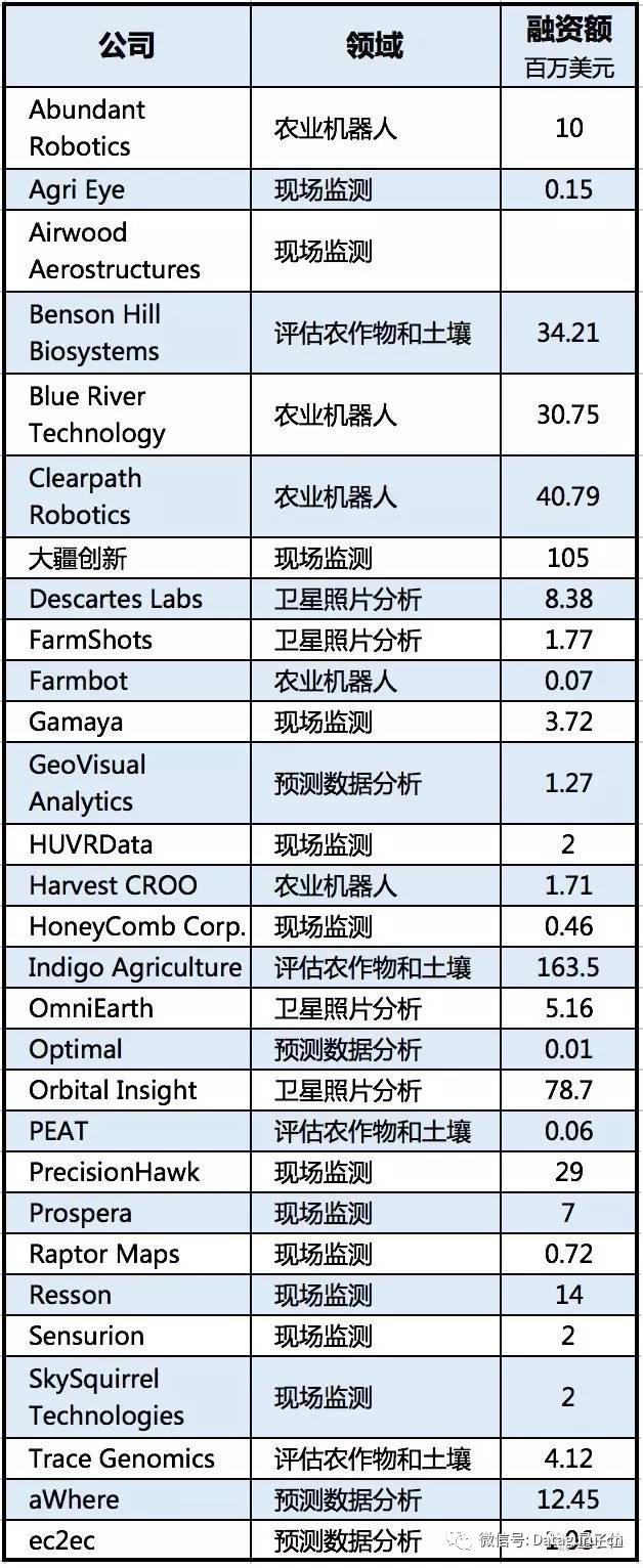 聪明的投资机构,例如Bessemer Venture Partners、Accel Partners、Khosla Ventures、Lux Capital和Data Collective,投资了许多专注农业场景的通用无人机和计算机视觉公司,例如大疆和Orbital Insight,以及农业科技创业公司,例如Blue River Technology。大企业,包括孟山都和先正达,也是活跃的农业科技投资者,投资了Resson和Blue River Technology等公司。