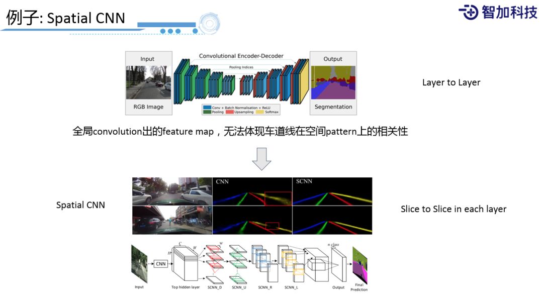 刚刚说的这些方法其实都是基于convolution这样传统的方法来去做的,它有一个局限,我们知道CNN是对整个图片都去做一次卷积,输出的feature map反映的还是整个图片的特性。但是对于车道线而言,它其实是很有规律的,就是近处看到一个车道线,在远处还是同一个车道线,是一个很有复制性的pattern,所以业界提出了一个很好的方法,叫Spatial CNN,把整个空间按照一个sliding window结合相邻window上一次的输出,叠加到新的sliding window输入上,相当于在图像上的RNN,只不过它是在一个单层的图像上来做的。通过这种方法就能学习出空间上的pattern,得到更好的车道线精度,对于我们来说是非常有用的。