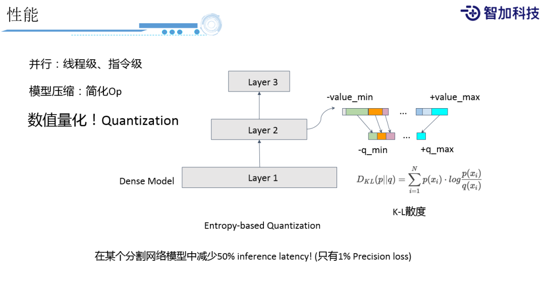 第二就是性能,我们在性能上除了会用一些特定的硬件,去做硬件加速。还包括软件上的一些传统方法,比如并行化这种优化,还有模型压缩的一些方法等等。还有一个很有效的一点,就是做数值量化,这里只是介绍一些我们的经验,因为大家知道我们在处理浮点数据,对GPU和CPU而言,它的性能要求还是非常高的,但实际上从整个数据的分布上来看,也不见得非得用这么高精度来表示数据。所以我们常用的方法就是量化,量化简单来做的话,可以做一个平均的量化,把一个0到100区间的数据,压缩到0到10区间,平均分成十份就可以了,这是最简的方法。但是,如果0到100区间中,这个数据的分布不是平均分布的话,这样做就会存在信息损失。所以我们会用基于Entropy的方法做量化,我们会看哪些数据,比较集中在多个区间上的,还是哪些数据,它在区间上是分布非常少的,这样在不同区间上,我们就可以有不同的在新的空间上的粒度,然后信息的损失,我们可以用K-L散度来计算出在老的区间上和新的区间上,它的熵的一个差值,去min、max差值来算出,这样一个新的区间应该怎样划分。图中是我们在数值量化上的一个应用,在我们的某个分割网络上的实践中,它能够减少50%的inference时间,而且精度上,在我们内部测只有1%精度的损失。这只是系统优化方法中的一点,还有很多环节需要优化。