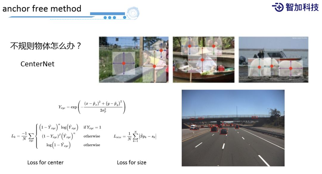 还有一个问题就是遇到这种不规则物体怎么办?比如图片中的小孩,如果用bounding box,整个bounding box之内物体的分布是很不规律的。因此业界提出了anchor free的方法,比如CenterNet,它的想法很简单,只预测每个物体/目标的中心点是什么就可以了。根据中心点和ground truth的中心点,计算它们之间的差距/距离。但是,ground truth中心点会按照高斯分布来分布出一个从中心点特征更明显,到周围比较弱一些的ground truth分布,再去跟预测点计算它的loss。可以看到这个形式其实很像刚才的Focal Loss,只不过这是一个计算点中心形式的Loss Function。同时,还会计算回归的大小,看什么样范围内的物体和ground truth匹配度更高一些。所以,在上图中,对于不规则物体,如桥上横着的货车,这种长条形状,我们也能够识别的很好。