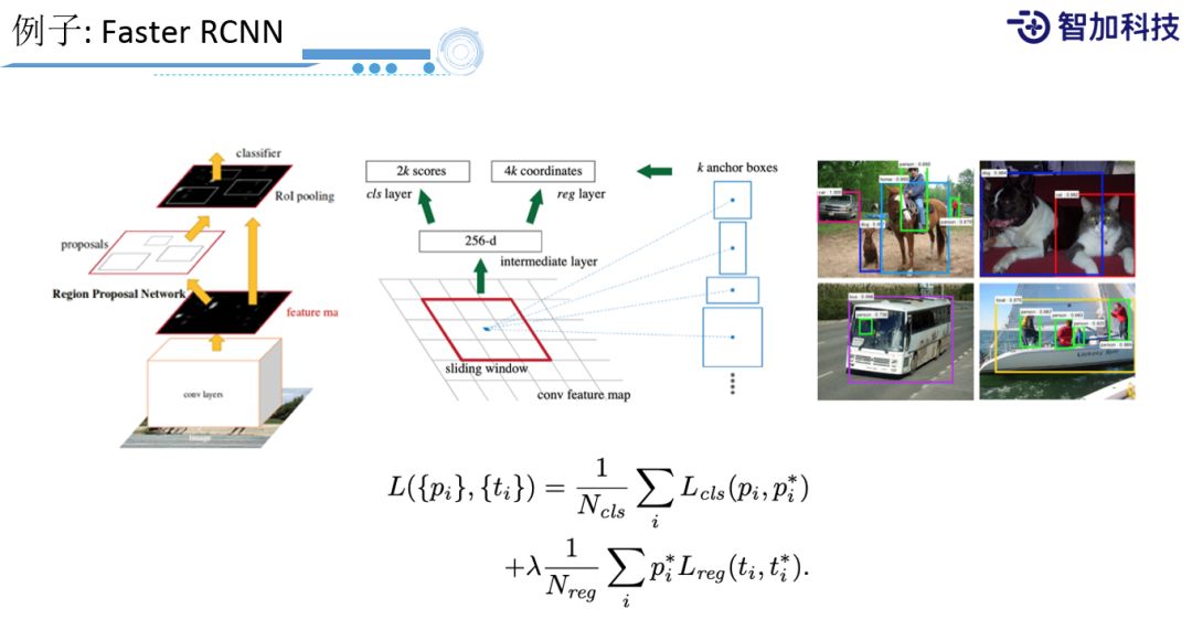 其中Faster RCNN是一个非常经典的做法,它是一个两阶段的算法,首先把图像通过卷积网络生成feature map,在feature map基础上预测出feature map上都有哪些region,region就相当于bounding box,预测出bounding box后, 再通过分类网络预测bounding box里面的图像,到底是什么样的类型。然后这两个网络会share之前的convolution network,所以在性能和效果上会达到一个比较好的tradeoff。同时,这里可以看到region proposal network是整个网里最关键的一个环节,它将整个网络划分成若干个grade,每个grade上的点生成固定的K个anchor boxes的候选,每个anchor box预测出它跟ground truth坐标的差距是多少,它是一个regression network。还有一个network是预测出物体到底是前景,还是背景,一个二分类网络。所以将这两个loss合并起来,当做整个学习的目标。所以,这也是为什么把这种方法叫做anchor-based,这里的anchor就是指region box。