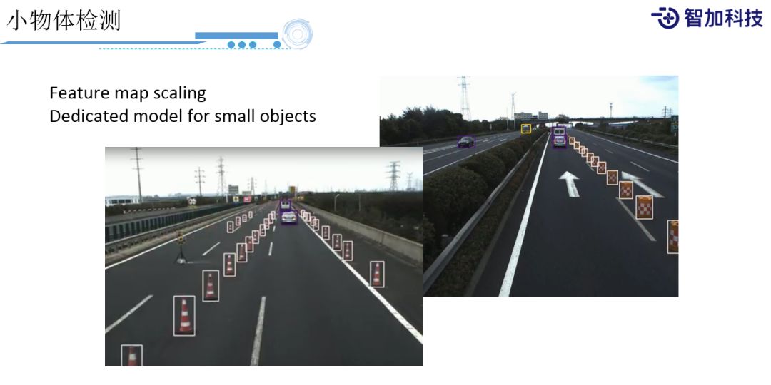 我们可以看下,我们采用这些方法后,实际中遇到的一些很有趣的问题。如左图,大家可以看到这是一个大车,是一个上下两层装载了很多小汽车的货车,从后面看它是两个小车,所以它到底是一个大车还是小车?这对于物体识别来说是一个很具有挑战性的例子,但我们还是能很稳定的识别出来。在这里,我们就借鉴了YOLO v3的思想,把feature map分成多个scale(级别),从小到大。将大物体在每个scale 的feature map都进行一次预测,这样大物体在小scale上能很好的预测出来。同时,它也兼顾了在大feature map上去预测小的分类物体。