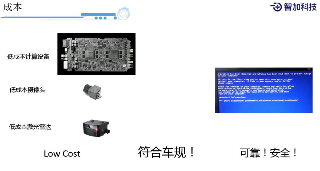 首先第一点是成本,因为我们要量产的话,首先要讲究经济效益,毕竟是做生意,需要尽量在低成本的设备上实现我们的自动驾驶。所以,我们需要选用低成本的计算设备,低成本的摄像头,低成本的激光雷达等等。