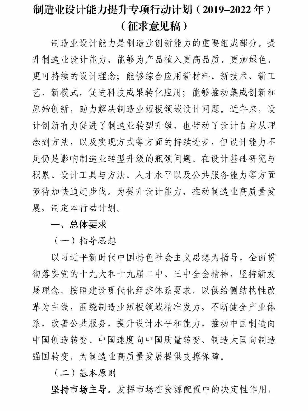 为有效改善制造业短板领域设计问题,完善工业设计基础研究体系,提升公共服务能力,创新人才培养模式,工业和信息化部(产业政策司)会同有关部门研究起草了《制造业设计能力提升专项行动计划(2019-2022年)》(征求意见稿),现公开征求社会各界意见。