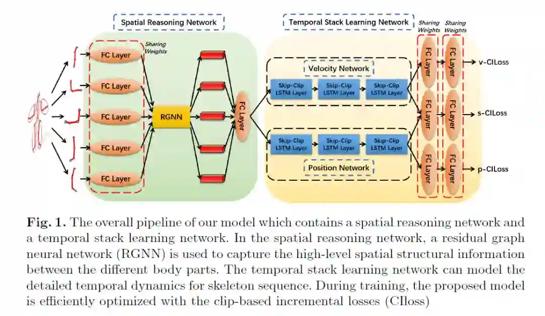 近几年基于人体骨架的行为识别已经有很多工作,这些工作在公开数据库上的精度都有很好的提升,但是仍然有一些问题没有解决:1、人的运动是由各个part协调完成的,如行走不仅需要腿的运动,还需要手臂的运动维持身体平衡,但是大部分的工作将人体的关键点直接concatenate成vector, 然后输入到LSTM里面处理,这样是很难学习到人体结构的空间特征的。2、现有的方法利用LSTM网络直接对整个骨架序列进行时序建模,然后利用最后一时刻的hidden state作为时序的表示,这样对于短时序是有效的,但是对于长时序序列,最后一时刻的状态很难表示整个序列的时序特征,也不能包含详细的时序动态特征。为了解决这两个问题,我们提出了Skeleton-Based Action Recognition with Spatial Reasoning and Temporal Stack Learning [5]。