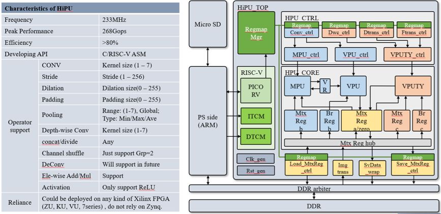 HiPU 是一款面向深度神经网络的通用加速器,完成了类似于英伟达的 NVDLA 与外部控制器的整合功能,并且在 FPGA 上的资源消耗与工作频率指标都有显著提升。由于西安交通大学人工智能与机器人研究所团队 (http://iair.xjtu.edu.cn) 主要面向专用集成电路 (AISC) 进行设计,其 FPGA 设计主要是进行功能的验证,因此,针对赛方提供的计算平台,我们需要对 HiPU 进行适当的裁剪,以适应 ZU3 的资源。图 3 所示为裁剪后的 HiPU 设计框图及其特性。在 Ultra96 板卡上,HiPU 可以在 233MHz 上运行,其峰值算力为 268Gops;采用 C/RISC-V 汇编作为编程接口,卷积效率平均在 80% 以上。