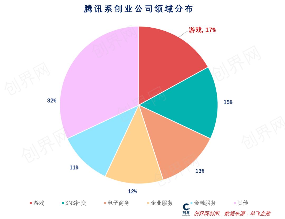 受市场等综合因素的刺激,一大批游戏公司如雨后春笋般应运而生,最多时达到了上万家,腾讯游戏系创业者也成为了当中的主力。根据单飞企业俱乐部2017年的统计数据显示,在腾讯系创业公司领域分布中,排名第一的就是游戏公司,占到了17%,其余领域中还有不少泛游戏领域项目。