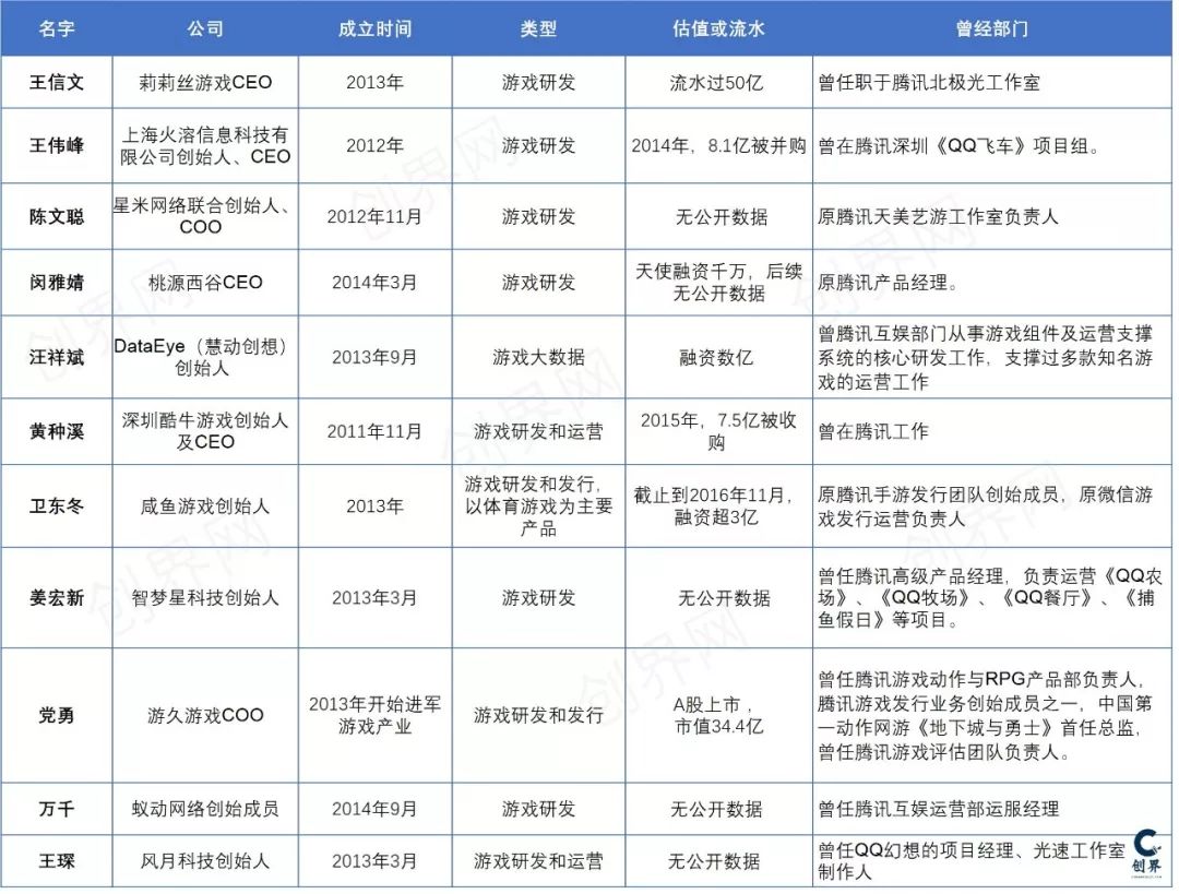 腾讯游戏创业系数据分析(部分,创界网整理制图)