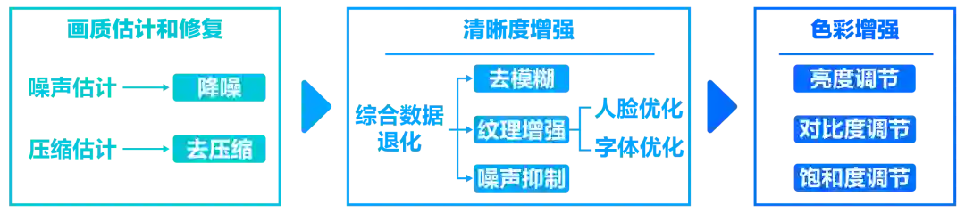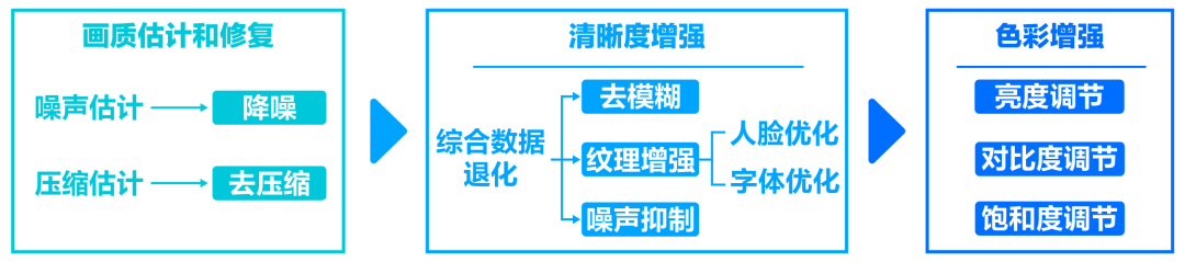 B:完善的媒体处理 Pipeline:在明眸的媒体处理的 Pipeline 中,积极引入基于传统信号处理的传统算法以及当前趋势所向的 AI 能力,先进行场景分析、毛刺检测、噪声检测、交错检测、质检以及 JND 等预分析流程,分析视频源的画面质量,然后针对不同的场景和画面质量情况,使用对应的画质增强 / 修复技术。修复后,明眸还会对画面进行二次分析,用来辅助后续的视频编码流程。