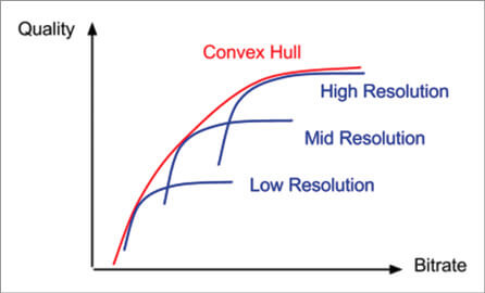赵军:业界的方案,大多受到 Netflix 的 Per-Title Encoding/shot-based Encoding 的影响。Netflix 在 2015 年提出了 Per-Title Encoding,从较高的视角来看,Netflix 使用了一种“暴力”编码技术,将每个源文件编码为数百种分辨率和码率的组合,以找到 "凸包",即最有效地约束所有数据点的形状;以为 VMAF 为目标以衡量人眼的主观评价。