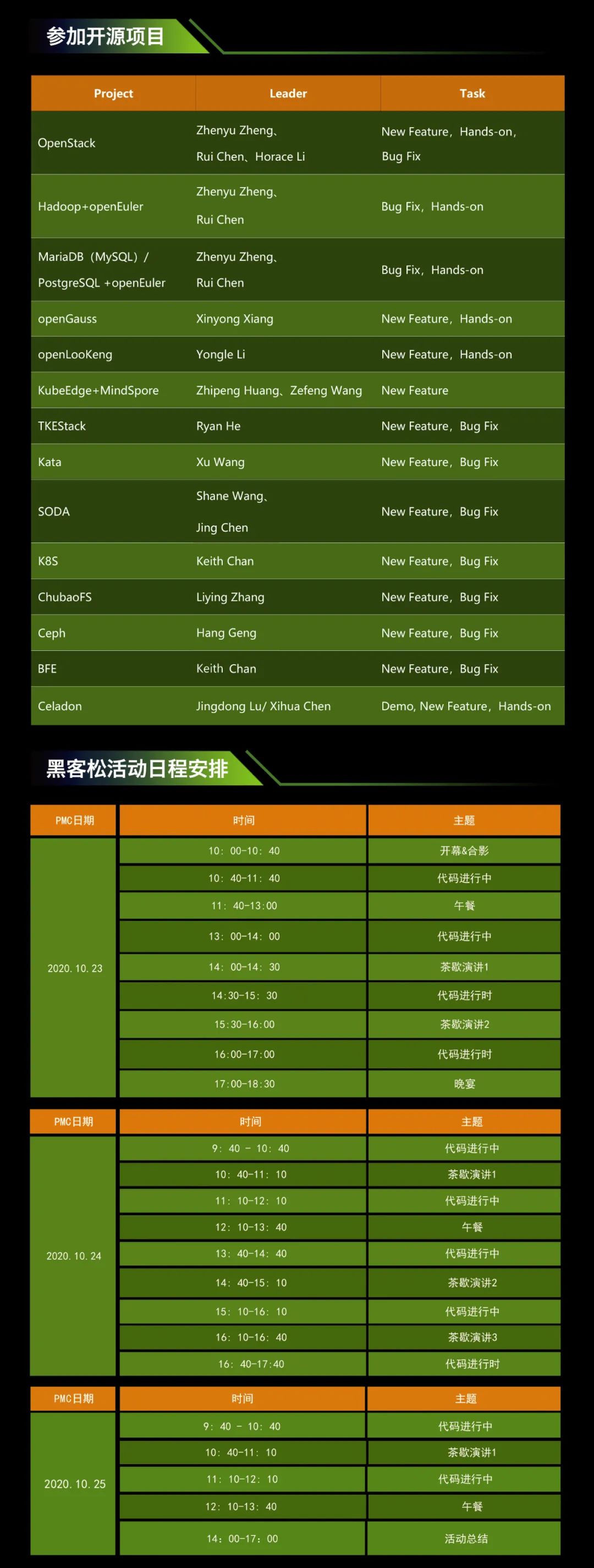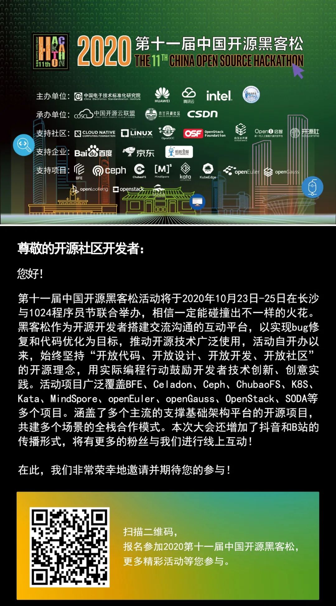第十一届中国开源黑客松活动将于2020年10月23日-25日在长沙举办。黑客松活动将与1024程序员节相结合,相信一定能碰撞出不一样的火花。黑客松作为开源开发者搭建交流沟通的互动平台,以实现bug修复和代码优化为目标,推动开源技术广泛使用,活动自开办以来,始终坚持“开放代码、开放设计、开放开发、开放社区”的开源理念,用实际编程行动鼓励开发者技术创新、创意实践。活动项目广泛覆盖openEuler、 MindSpore、openGauss、OpenStack、K8S、SODA、Kata、Ceph、ChubaoFS、Celadon、BFE等多个项目,活动参与者超百人规模。涵盖了多个主流的支撑基础架构平台的开源项目,共建多个场景的全栈合作模式。本次大会还增加了抖音和B站的传播形式,将有更多的粉丝与我们进行线上互动!