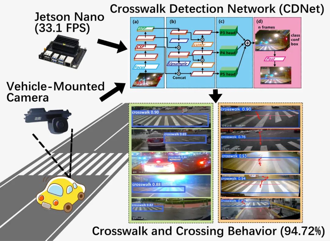 在复杂场景和有限计算能力下实现实时、鲁棒的斑马线(人行横道)检测是当前智能交通管理系统(ITMS)的重要难点之一。有限的边缘计算能力和多云、晴天、雨天、雾天和夜间等真实复杂的场景同时对这项任务提出了挑战。本研究提出基于改进YOLOv5的人行横道检测网络(CDNet),实现车载摄像头视觉下快速准确的人行横道检测,并在Jetson nano设备上实现实时检测。强大的卷积神经网络特征提取器用于处理复杂环境,网络中嵌入了squeeze-and-excitation(SE)注意力机制模块,使用负样本训练(NST)方法提高准确率,利用感兴趣区域(ROI)算法进一步提高检测速度,提出了一种新的滑动感受野短时向量记忆(SSVM)算法来提高车辆交叉行为检测精度,使用合成雾增强算法允许模型适应有雾的场景。最后,在 Jetson nano 上以 33.1 FPS 的检测速度,我们在上述复杂场景中获得了 94.83% 的平均 F1 分数。对于晴天和阴天等更好的天气条件,F1 分数超过 98%。该工作为人工神经网络算法优化方法在边缘计算设备上的具体应用提供了参考,发布的模型为智能交通管理系统提供了算法支持。