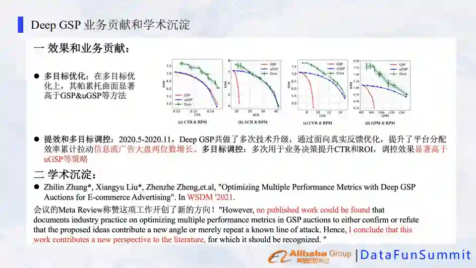 在多目标优化方面,帕累托曲面显示Deep GSP效果优于GSP、uGSP。在提效与多目标调控方面,Deep GSP在2020.5-2020.11共做了多次技术升级,通过面向真实反馈优化,提升了平台分配效率,累计拉动信息流广告大盘两位数增长。多目标调控方面,多次用于业务决策提升CTR和ROI,调控效果显著高于uGSP等策略。
