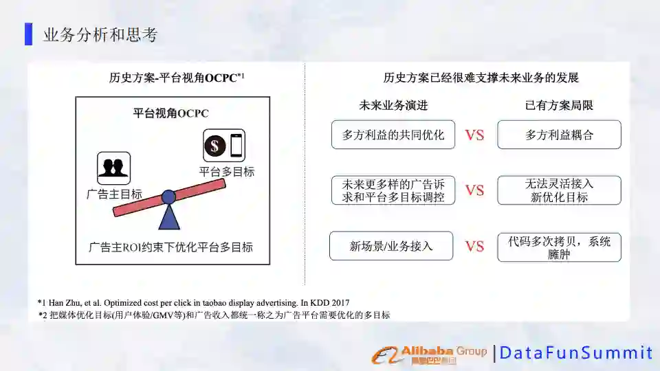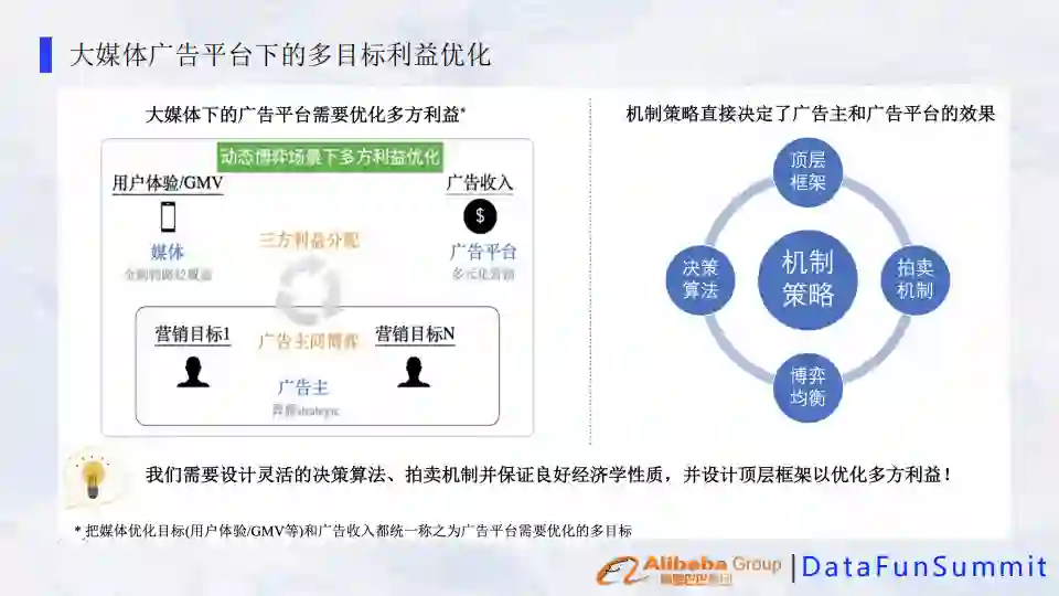 面向未来业务发展,多方利益优化、经济性公平均衡等,阿里妈妈展示广告设计了智能决策分配框架,简称AIDA。