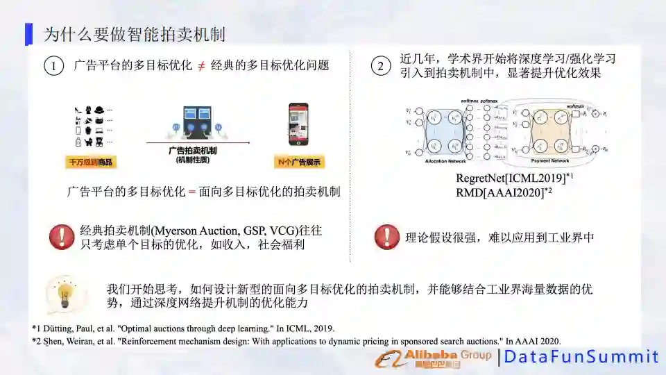 因此我们开始思考,如何设计新型的面向多目标优化的拍卖机制,并结合工业界海量数据的优势,通过深度网络提升机制的优化能力。