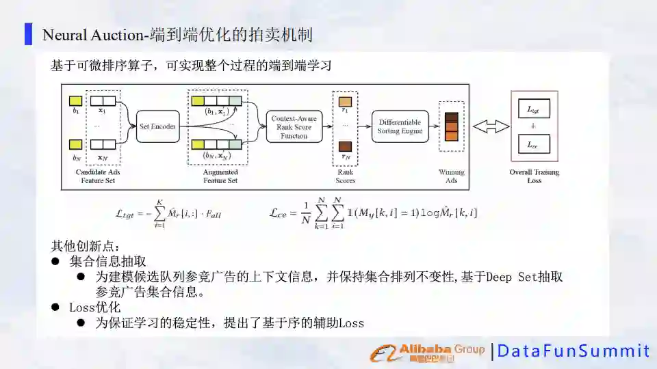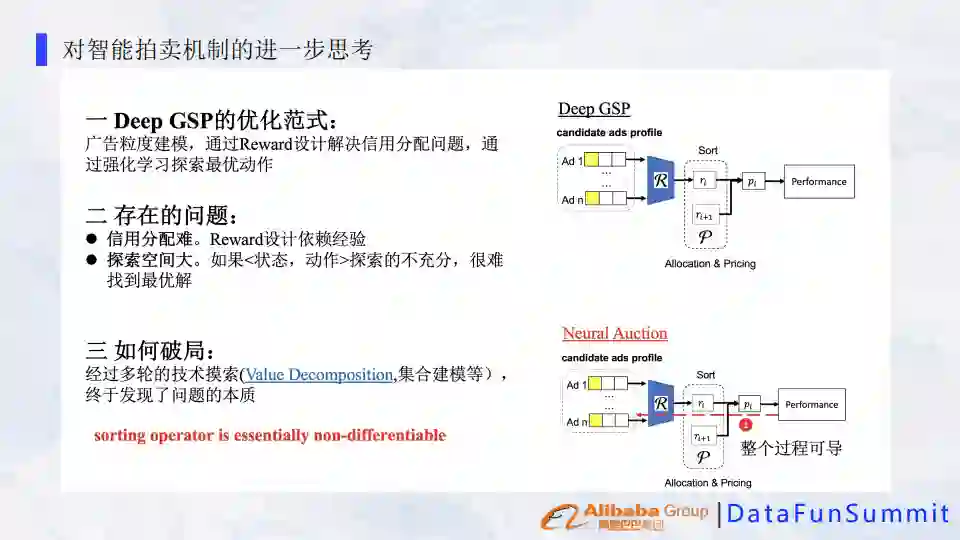 为突破Deep GSP的问题,经过多智能体value分配或者集合建模,尝试将所有的广告主参竞放在一个集合中优化,建模和效果在同一个维度,省去做信用分配,单目标优化有效,但是多目标优化效果不明显。单目标是端到端优化,只要学出value的分布,然后进行softmax,将最大的作为展示广告,第二作为扣费。多目标下需要对所有的广告先排序,基于排序结果进行分配扣费,但是排序过程不可微,无法像监督学习通过优化效果,通过Loss反向传递驱动模型训练。因此,推出Neural Auction拍卖机制,通过最后的效果反向传导的方式,驱动整个模型训练,实现端到端学习。
