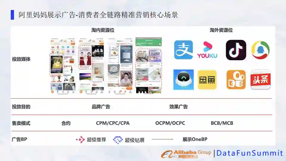 广告主投放目的方面,广告主商品种类繁多、营销目标各异。为了更好地满足广告主的营销服务,阿里妈妈推出了一系列的智能营销工具。比如品牌广告的合约售卖模式,效果广告的CPM/CPC/CPA售卖模式,针对这些基础类型投放的一些优化产品有OCPM/OCPC及更加智能的BCB/MCB等。另外,展示广告资源位也越来越多,为了帮助广告主同一份预算投放在所有媒体上,近期阿里妈妈也推出了展示OneBP。