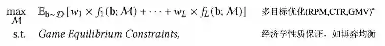 其中f(b;M)函数是优化目标,比如RPM、CTR、GMV。优化目标的约束条件是经济学性质,比如均衡博弈,即在保证良好的经济学性质下优化多目标。