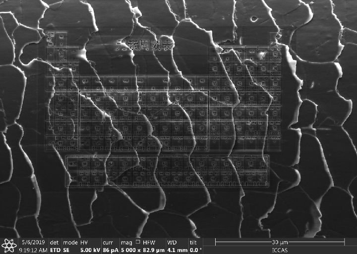 这是一根头发!化学所高级工程师关波带领团队,使用双束电子显微镜,用等离子束在头发上微加工得到的一“根”元素周期表。科学家们用创意和科技,在微观尺度百级纳米级别上进行定点刻蚀,绘制了一幅在门捷列夫时代无法想象的元素周期表。