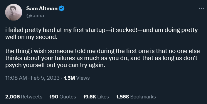 他上个月在推特上写道:「我在第一次创业时失败得一塌糊涂 —— 太糟糕了!而在第二次创业中,我做得很好。我希望有人在第一次失败时告诉我的事情是,没有人会像你那样思考你自己的失败,只要不让自己丧失信心,你就可以再试一次。」