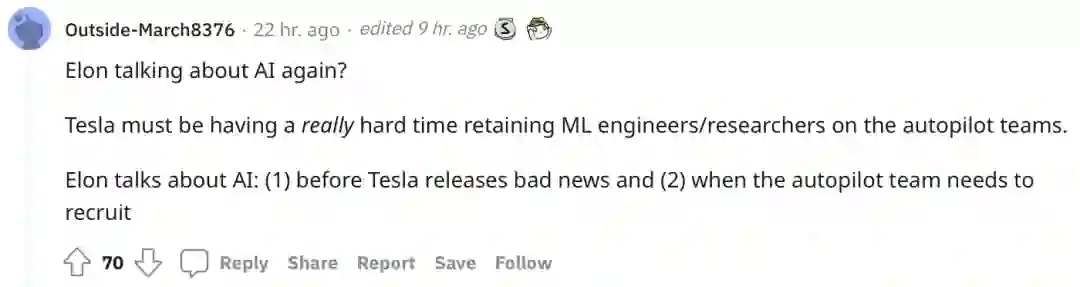 「每次马斯克谈论AI,不是特斯拉有坏消息要发布,就是自动驾驶团队要招人了。」