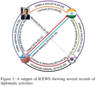 知识图谱在知识驱动的信息检索、自然语言理解和推荐系统领域有着广泛的应用。一个知识图谱只拥有静态某一时刻的事实,而目前快速增长的数据往往表现出复杂的时间动态,即时序知识图谱(TKG)。具有代表性的时序知识图谱包括全球事件、语言和音调数据库(Global Database of Events, Language, and Tone, GDELT)和综合危机预警系统(Integrated Crisis Early Warning System, ICEWS)。下图 1 展示了 ICEWS 系统的一个外交活动记录子图。
