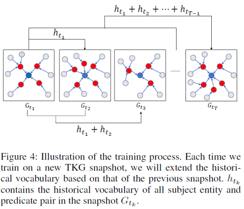 在训练过程中,研究者按照时间顺序依次训练每个时间片的知识图谱。每训练一个新的时间片的知识图谱,他们都会将该时间片之前的所有历史重复事实加入到历史词汇表,如下图 4 所示(验证和测试的时候,研究者使用整个训练集的历史信息)。