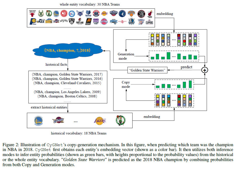 如下图 2 所示,研究者以预测 2018 年 NBA 冠军球队为例,总体介绍了 CyGNet 模型的预测流程。