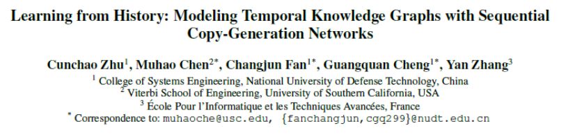 所以,为了能将时间事实的复杂演变现象融入并建模时序知识图谱,来自中国国防科技大学、美国南加州大学、法国计算与先进技术学院等机构的研究者相信更有效地利用历史上发生过的已知事实能够提高时间事实推断的精度。他们决定借鉴在自然语言生成中的复制机制(copy mechanism)思路,探索一种新的框架,通过有效学习时间重复模式以更精准地建模时序知识图谱。