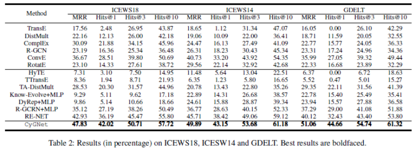 最后,研究者在 ICEWS18、ICEWS14、GDELT、WIKI 和 YAGO 等 5 个公开 TKG 基准数据集上进行了广泛的实验,结果表明 CyGNet 在未来事实(链接)预测任务上优于以往 SOTA TKG 模型。