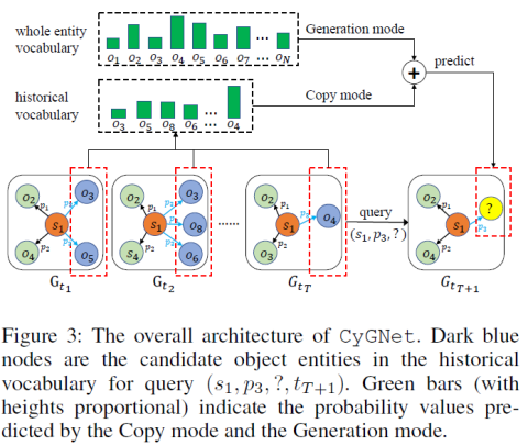 其次,研究者通过时间感知复制生成(copy-generation)机制创建了一个新的时序知识图谱嵌入模型CyGNet(Temporal Copy-Generation Network) 。该模型能够结合两种推理模式以根据历史词汇表或整个实体词汇表来进行推测,从而更符合上述 TKG 事实的演变模式。