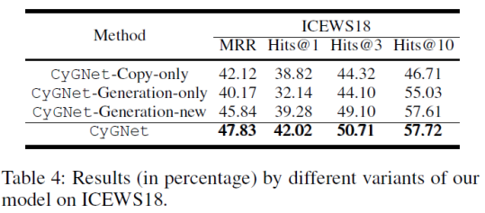 CyGNet-Copy-only 是当 CyGNet 只使用复制模式,CyGNet-Generation-only 只使用生成模式,CyGNet-Generation-new 是 CyGNet 模型改变生成模式的词汇表,即生成模式只从全新的从未发生过的实体中选择。如下表 4 所示,每个模块都对模型产生了重要的作用。