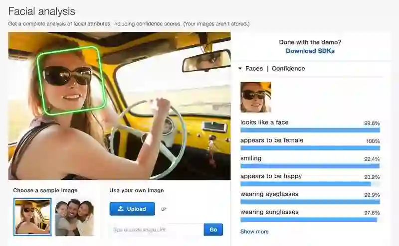 以上图的人脸检测 API 为例,用户可以通过输入的图像检测到面部的存在和位置。除了面部边界框和标注,API 还会反馈每张面孔的特征,如情感、性别、眼镜、睁眼或闭眼、胡须、微笑等。
