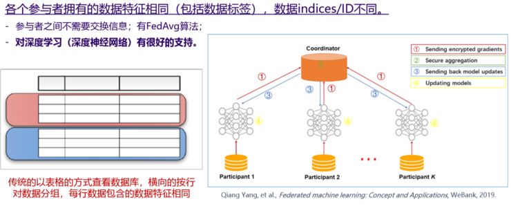 我刚才讲的是“横向联邦学习”,横向联邦学习是每行过来都可以看作一个用户的数据。按照用户来分,可以看作一、二、三个手机,它叫横向学习。还有一个原因是它们的纵向都是特征,比如手机型号、手机使用时间、电池以及人的位置等,这些都是特征。他们的特征都是一样的,样本都是不一样的,这是横向联邦学习。