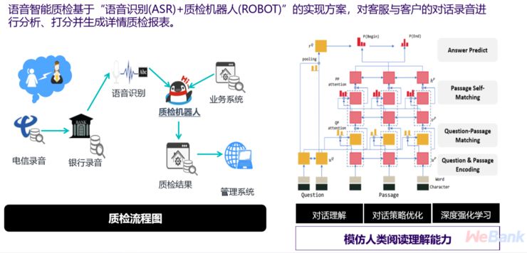 上图是质检流程,我们在注意力机制下用深度学习来帮助做对话理解。质检可以帮助发现用户贷款时,客服需要做的改进,比方有些不应该拿贷款去投放给非常有风险的人或场景,有的时候,客服也要保持微笑的态度,如果质检机器人发现机器人客服态度不好,也会自动预警。